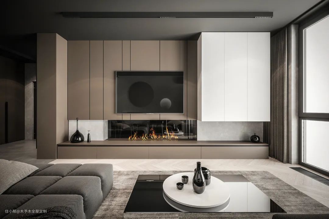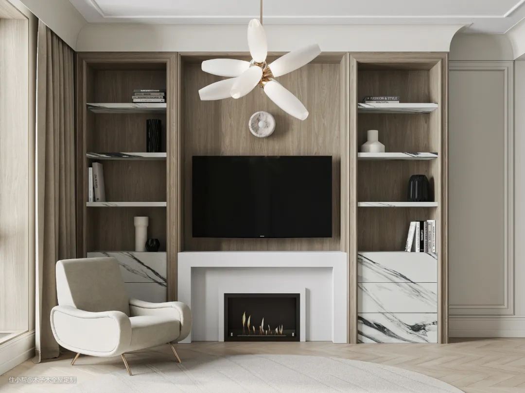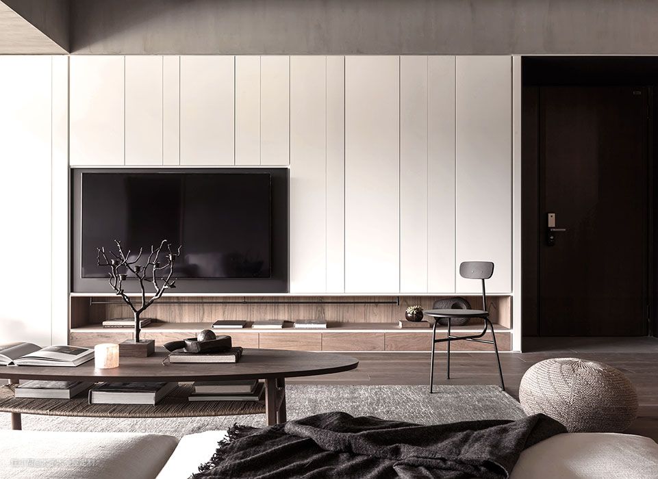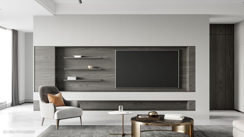 定制柜体背景墙可以根据整体的设计风格选择定制的造型及饰面板的样式,极简风格下可以选择无拉手平面造型,欧美风格可以选择带框线的门板造型,可以搭配相应的镂空隔板,玻璃门等,也是电视墙设计中非常好的选择。