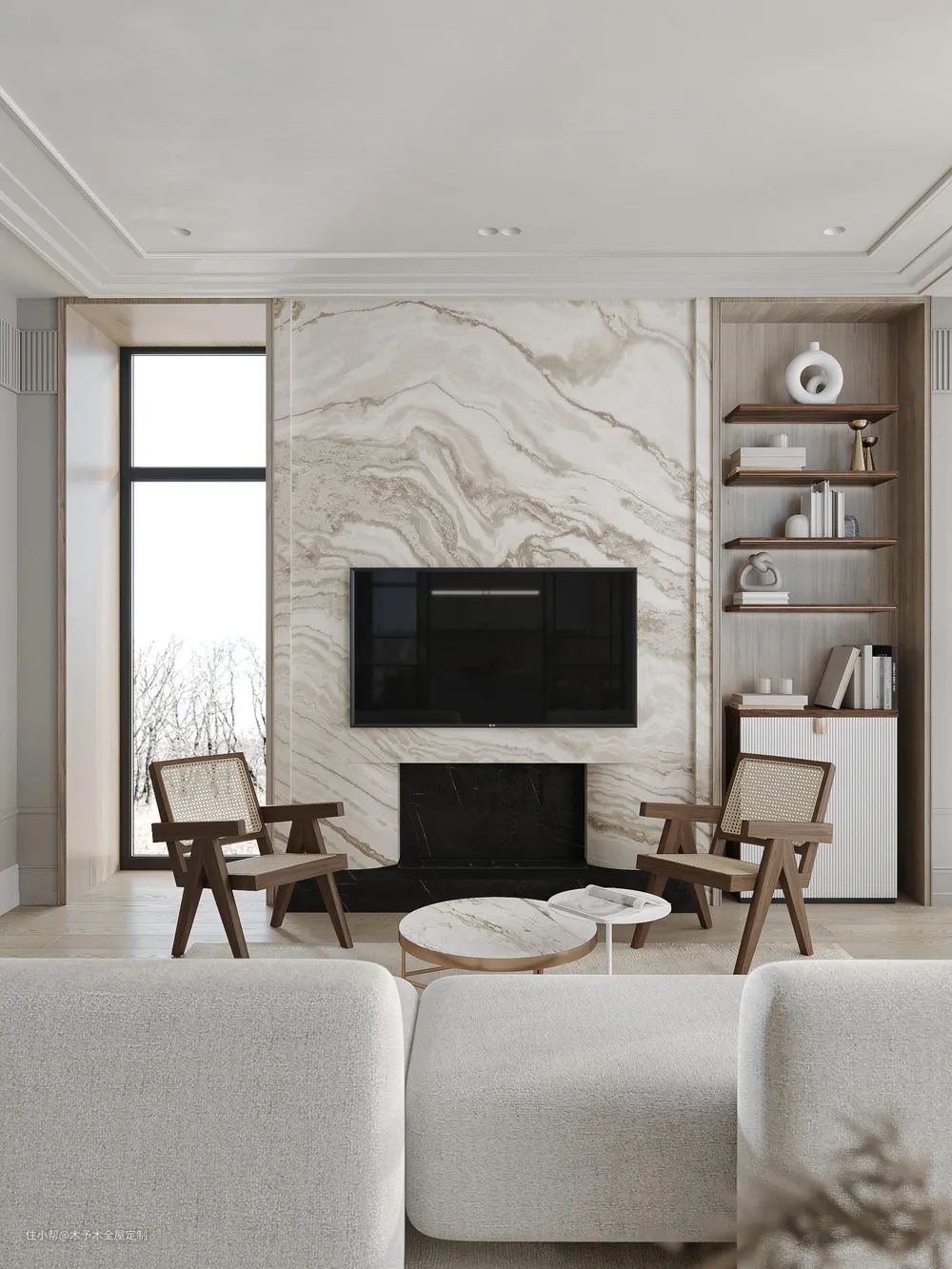 大理石的天然花纹、光泽、质感都非常优越,且大理石具有很高的可塑性,可以加工任意形状。将优雅的大理石花纹融于背景墙的设计,呈现出不俗的艺术感。