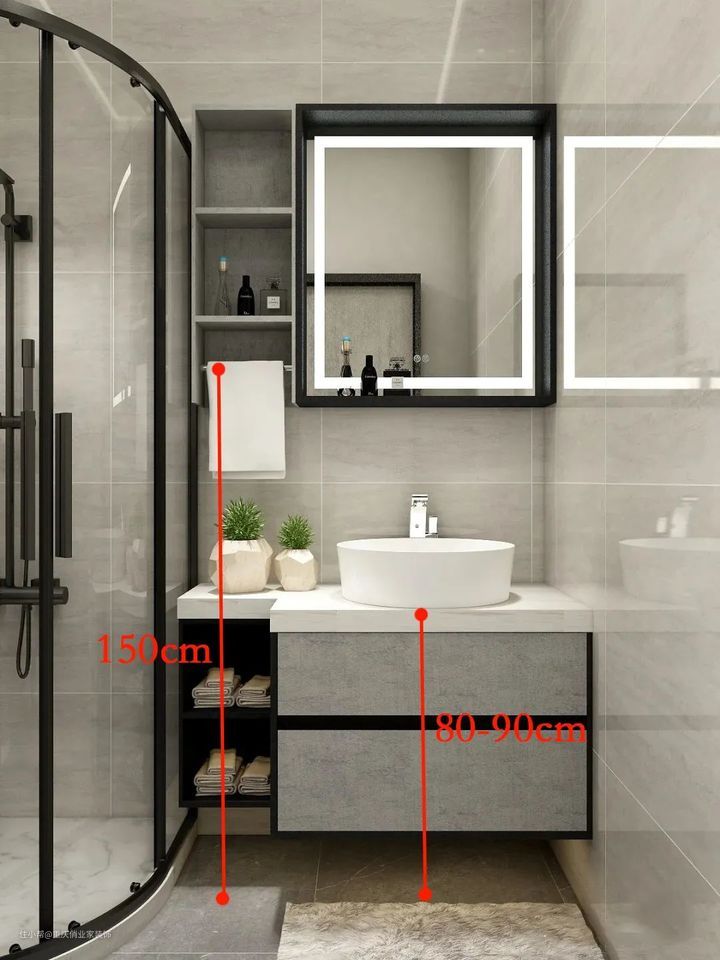洗手台80-90 cm高,浴巾架距离地面150 cm,便于拿放。