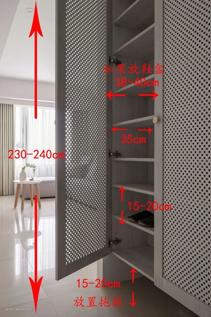 鞋柜深度35cm左右(一般以家中最大码鞋长度为准),如果放鞋盒38~40cm,一定要保证柜子可以关上!鞋柜的高度230~240cm,最好打到顶,不留空隙。鞋柜与地面之间最好留15~20cm空隙,方便放置日常换脱的鞋。鞋柜层板之间的高度一般在15~20cm。