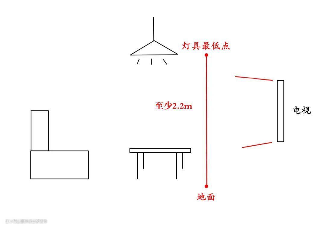 普通吊灯的最低点离地面不低于2.2米,这个距离大于电视的5个角度,不会产生炫光,看电视的效果更好。