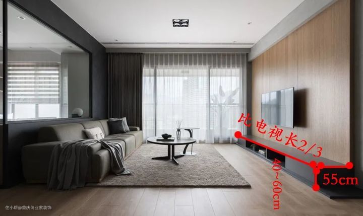 如果电视机下方有电视柜。它的长度通常要比电视机长三分之二,高度在40~60 cm之间,深度在55 cm左右。若电视柜下方与地面悬空,则悬挂高度应注意参考扫地机器人。