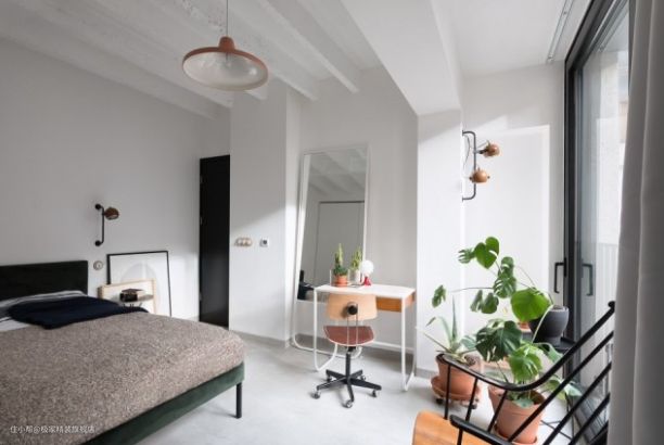 卧室和卫生间这两个功能区被设计师移阳台的附近。卧室中搭配众多绿色植物,整个卧室既温馨又不失生活气息。