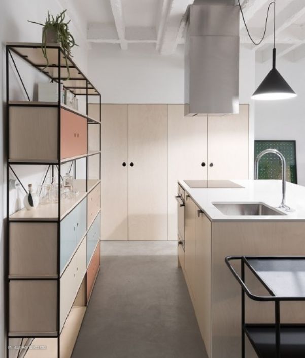 开放式的厨房只有拥有基本厨卫设施,没有过多华而不实的设计,专门定制的可移动式储物架,让厨具之类厨房用品能够获得更好的储藏空间。