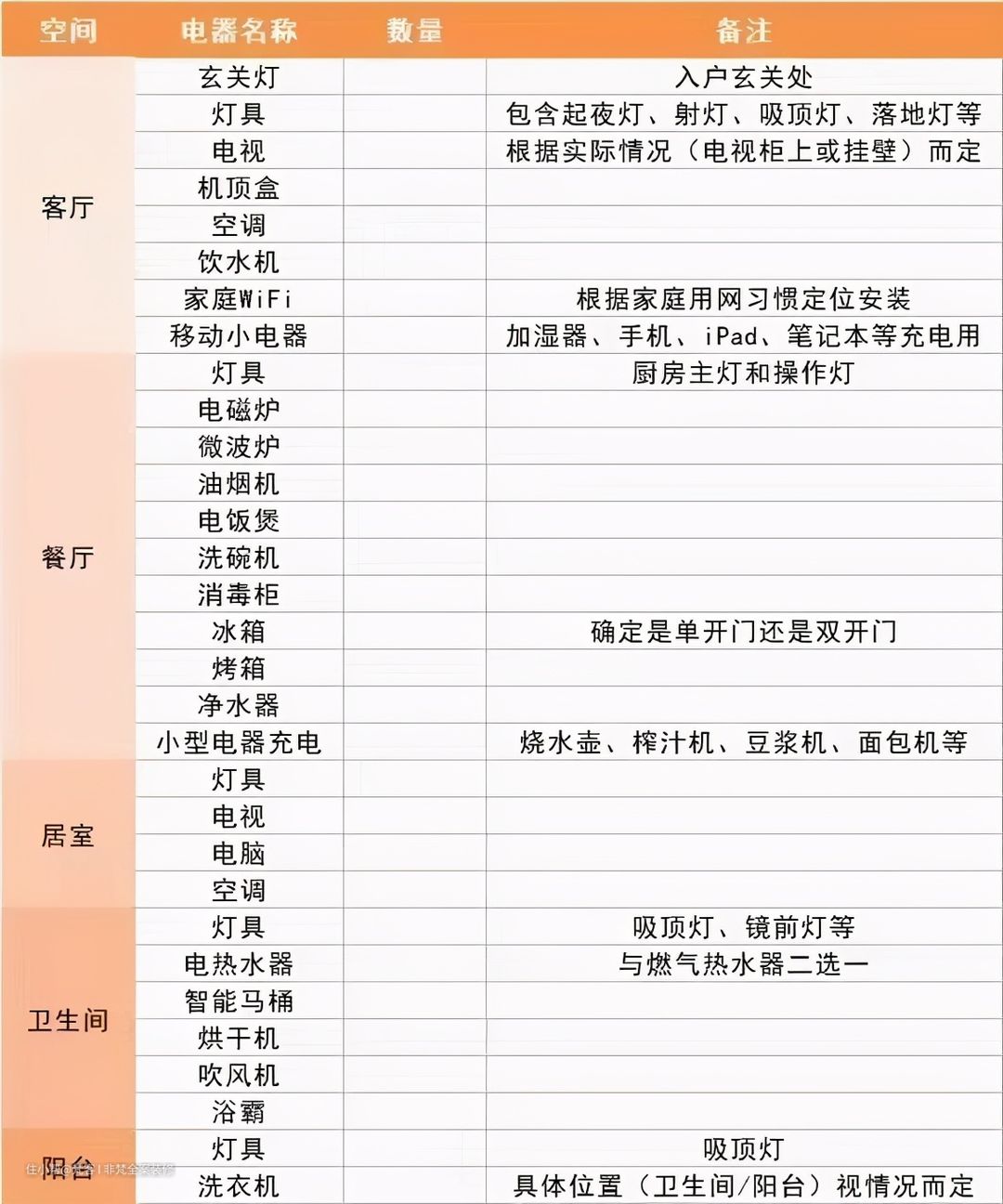 非梵君在此为大家贴心准备了一份家中区域常用电器列表,这样可以检查哪些地方插座开关安少了,根据电器列表安装(并且多预留一些)也可避免日后产生麻烦。