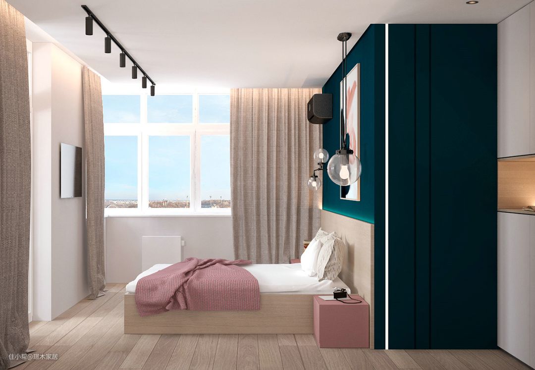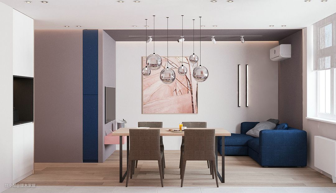 蓝色是一种纯净、永恒的颜色,在于粉色搭配时会使空间增加宁静感。