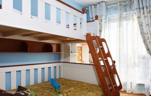 儿童房宽度比较窄,面积也比较小,所以床就选择了南北放,选上下床是考虑偶尔父母来住。主卧与儿童房之间的墙体拆除了,利用原来的墙体位置做了儿童房的收纳柜。