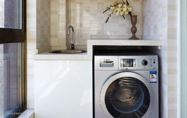 由于空间有限,阳台必须具有操作功能,洗衣槽的旁边正好放下一个洗衣机,而下方特地做成了柜子用来放些杂物。