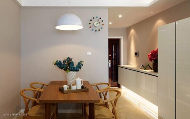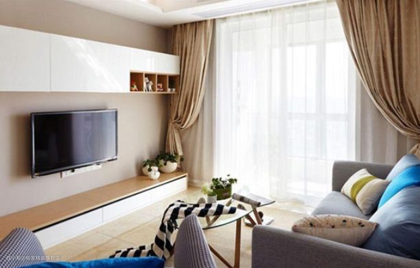 整个房间的装修以米色为主基调,素雅简洁。浅米色的地面砖百搭又易于打理,在茶几下铺设了地毯,中和了瓷砖硬朗的冰冷感觉,浅浅的绯色墙面也带着那种小温暖,给人以温馨家的感觉。