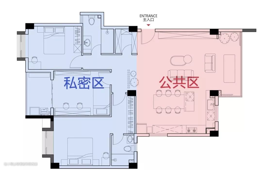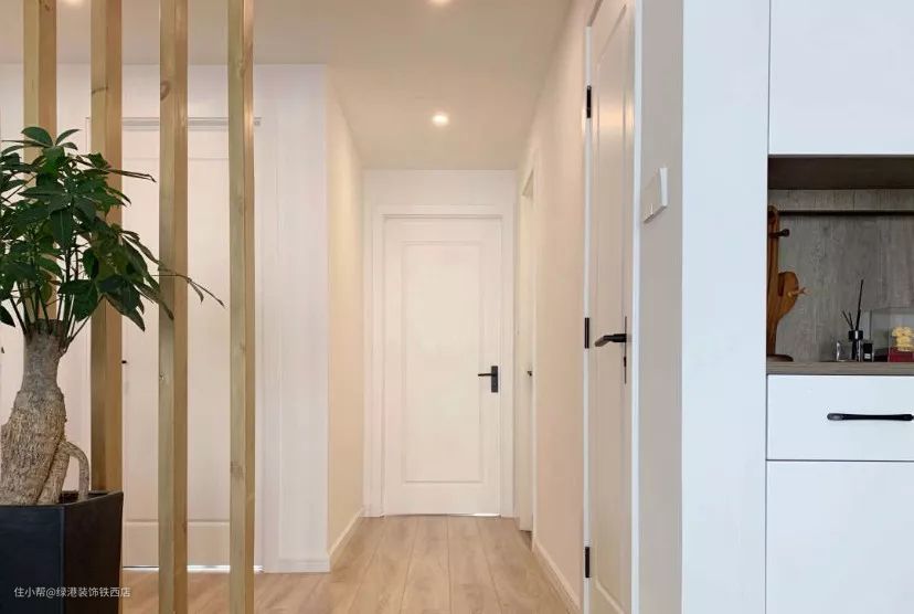 主卧门洞位置调整后,动线清晰,功能区一分为二,一进门是公共区,南面的三个房间及走廊形成私密区。同时明确设计和预算投入的重点在公共区,私密区则尽量简单清爽,减少投入。