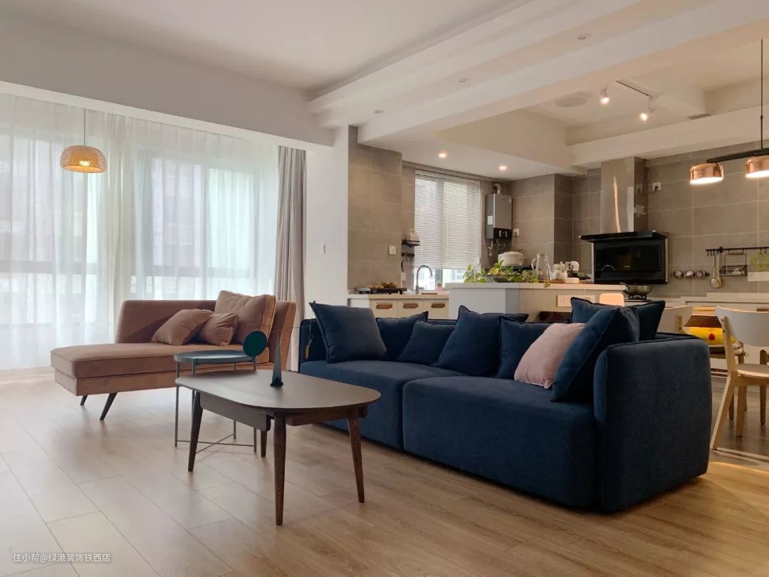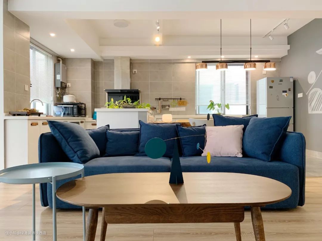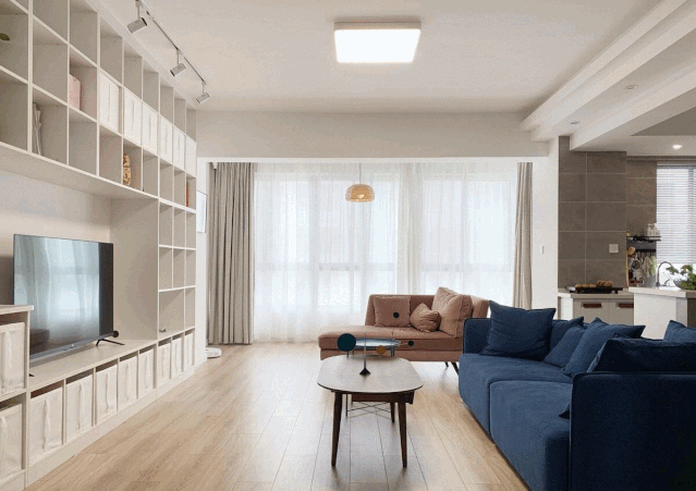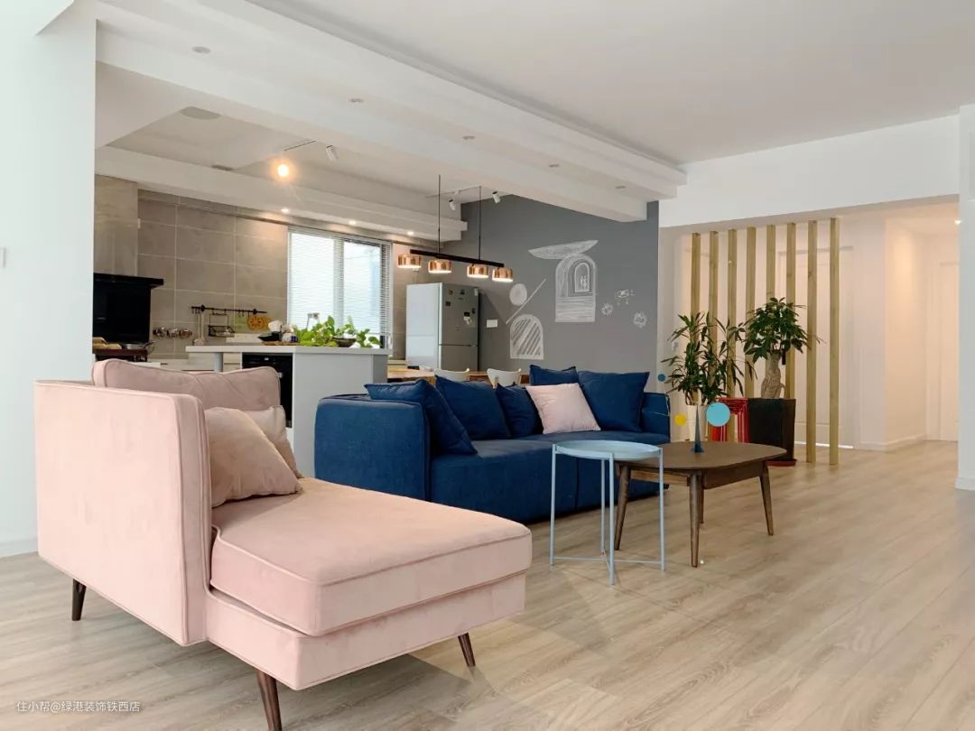 设计时控制整体背景色调,让其尽量单纯,软装才能有发挥的余地,客厅沙发选了活泼的粉蓝撞色,点亮空间。