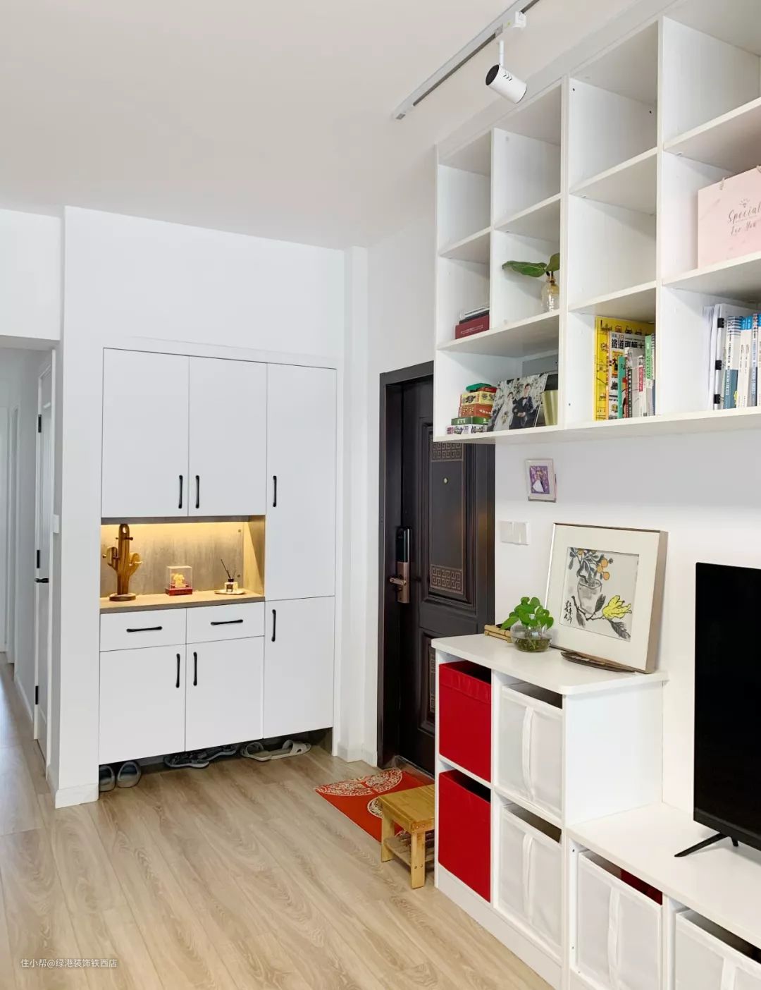 进门右手边,利用原储藏间的侧墙做一面鞋柜,下部镂空,放当日穿脱的鞋子,中间展示区,藏了一个LED硬条灯,光线比灯带均匀。