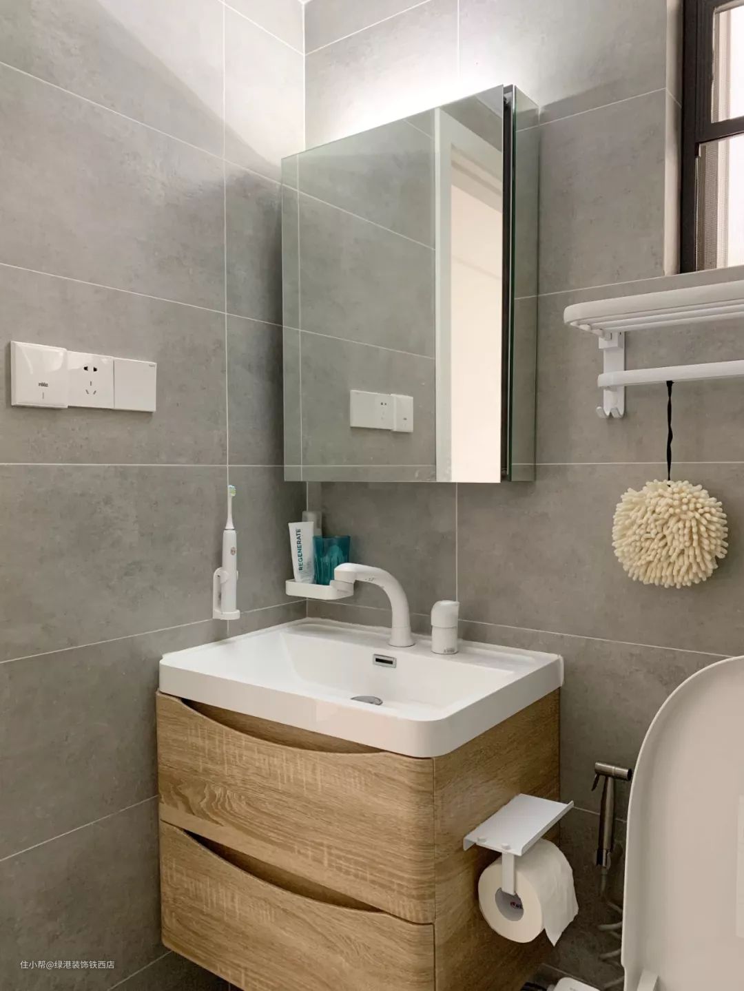 主卧卫生间配了镜柜和抽屉,收纳日常护肤用品。三荣的可抽拉龙头,洗头洗水池很方便。常湿的小物品仍然选择上墙,南方太潮了,无法接受放到镜柜中。纸巾架选择能置物的款式,上厕所时手机也有处安放了。