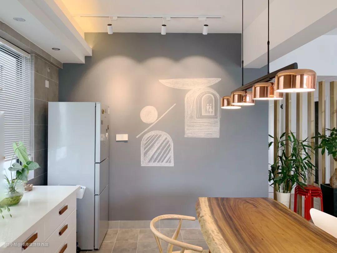 玫瑰金吊灯和灰色黑板墙搭配和谐,光线是最高级的装饰手段,射灯价格不贵,却能轻松营造美术馆般的空间感。