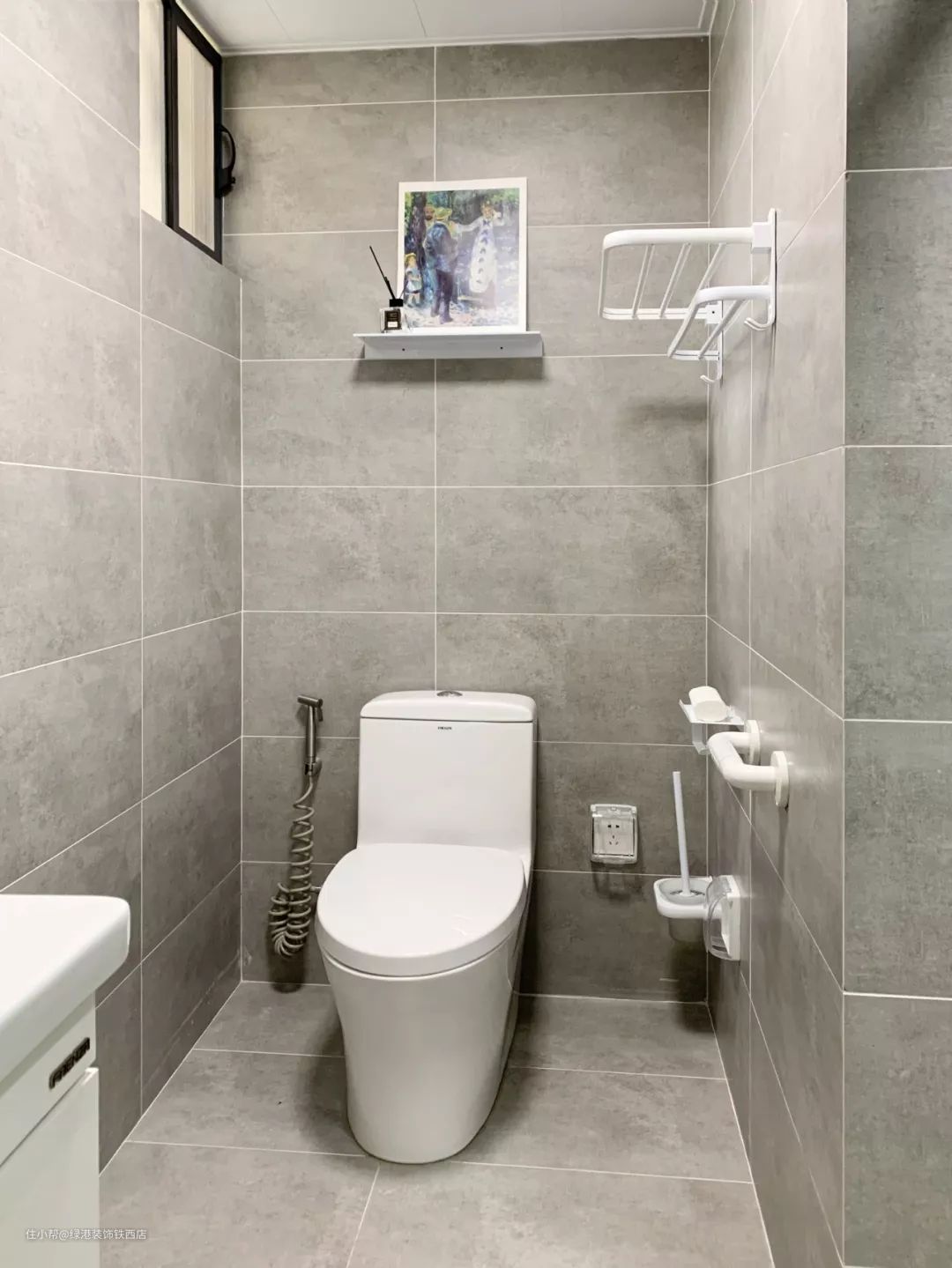 卫生间选择和厨房一样的水泥砖,所有洁具和配件都选了白色,能上墙的都上墙,清清爽爽。马桶旁配了喷枪,用来清洁东西,很方便。