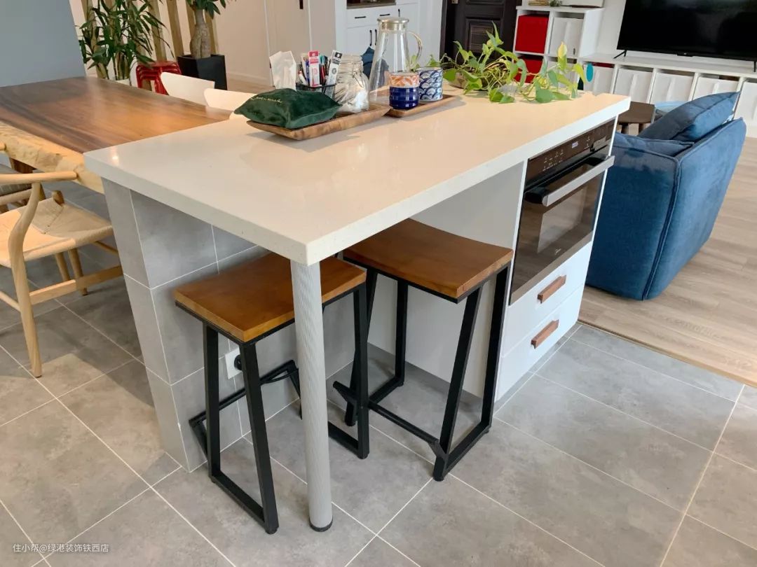 岛台下新砌的矮墙,可以满足两面装插座的需要,办公、烹饪都很方便。