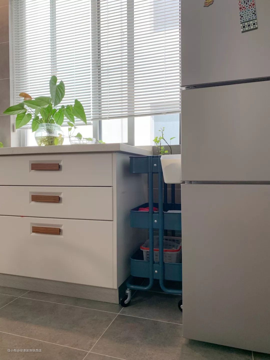 家里目前买的是三门小冰箱,但预留了将来换大冰箱的空位,现在多出来的空间,买了宜家小推车,放一些蔬菜水果和杂物。