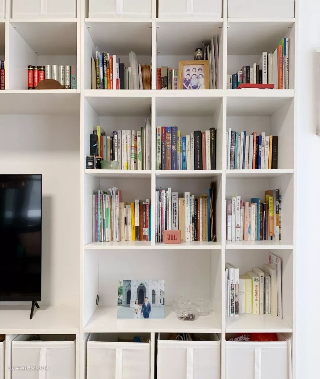 白色书架,减弱存在感。最下面一排塞进储物箱,放客厅需要用的家居物件,将来有了孩子,也可以放他的书和玩具。上面通长两格的位置是预留给打印机的,现在暂时先摆上照片。