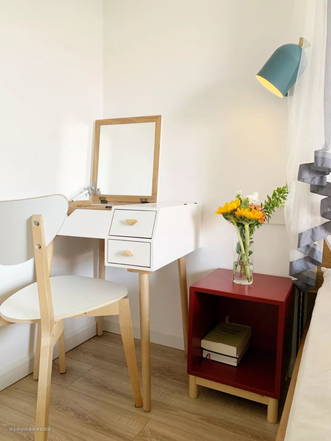 夏天挂了蚊帐,换了个小巧的床头柜。