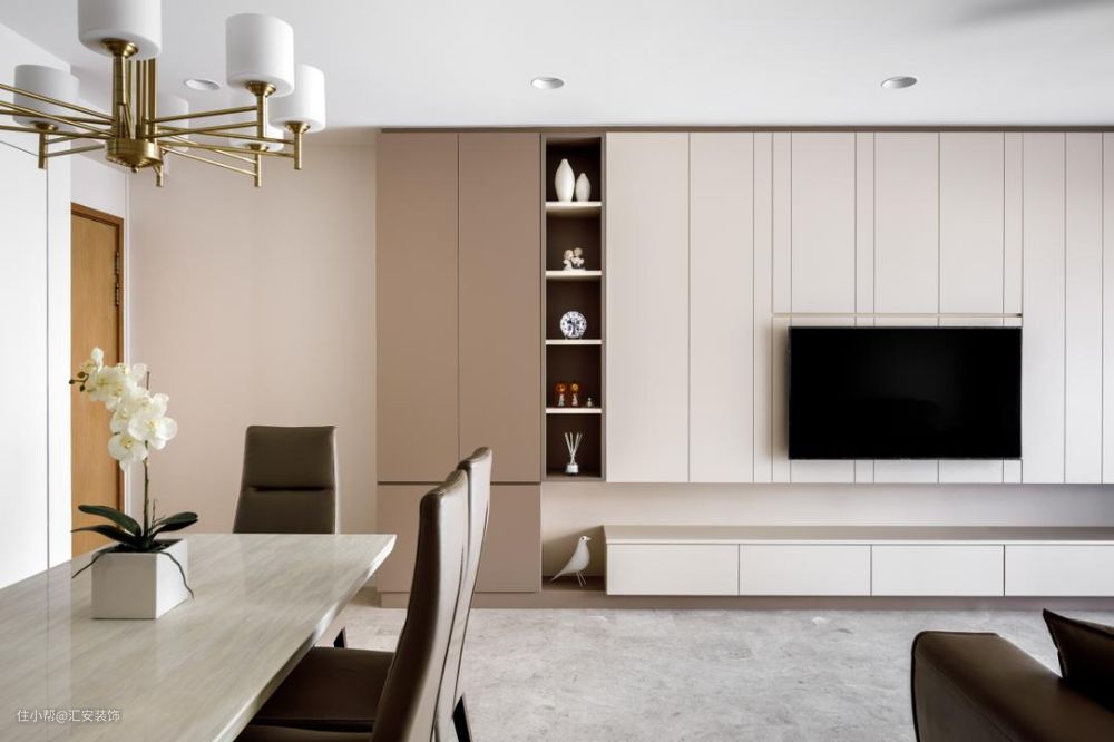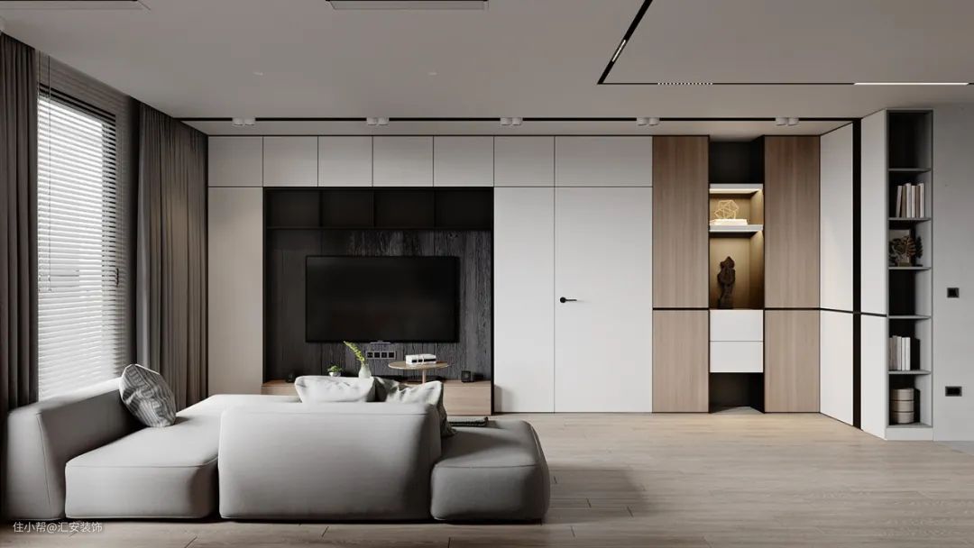 定制柜体背景墙可以根据整体的设计风格选择定制的造型及饰面板的样式,极简风格下可以选择无拉手平面造型,欧美风格可以选择带框线的门板造型,可以搭配相应的镂空隔板,玻璃门等,也是电视墙设计中非常好的选择。