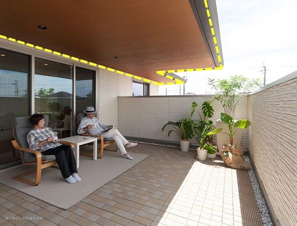 日本的阳台大多是内阳台,是介于阳台和露台之间的形式,一半屋顶一半露台。朝外的一面也会用木格栅或者百叶窗来遮挡,这样也能起到一定的保护隐私作用。