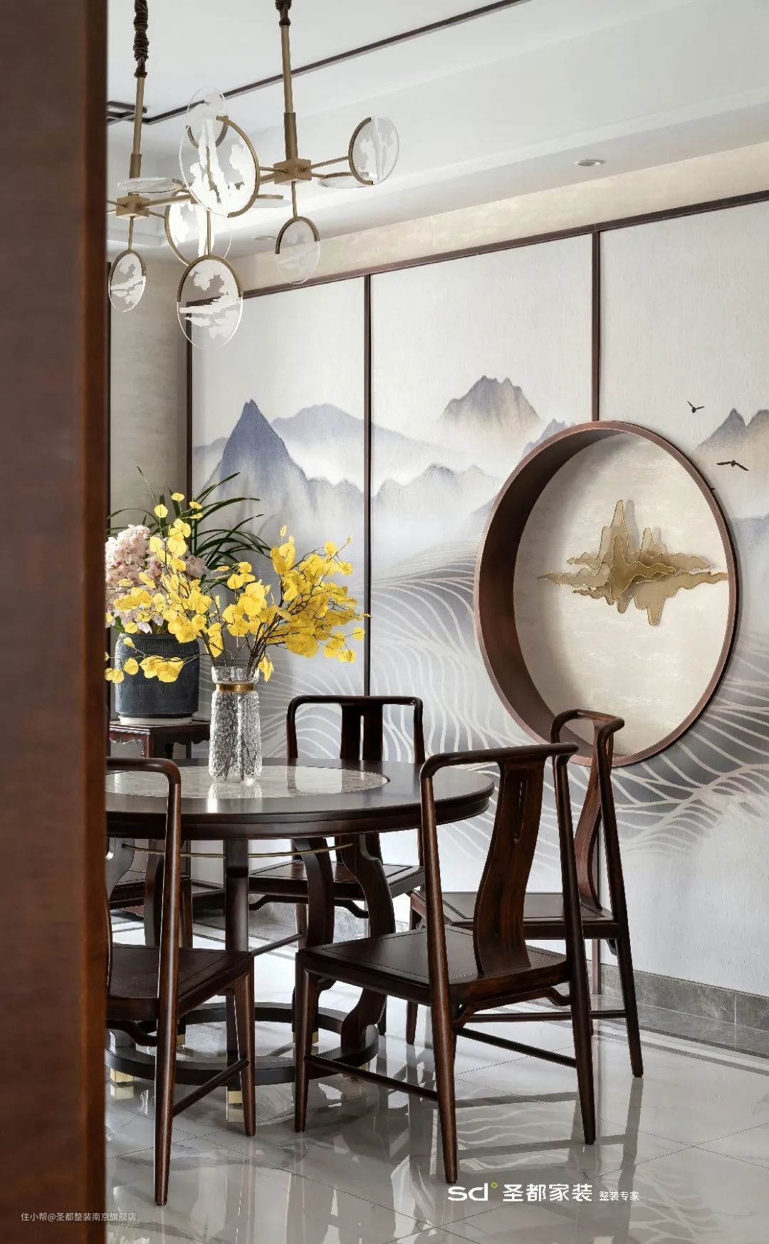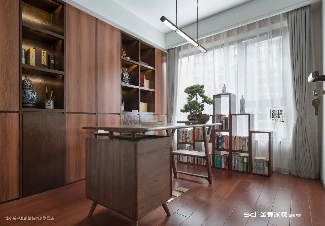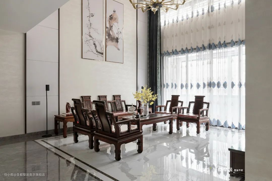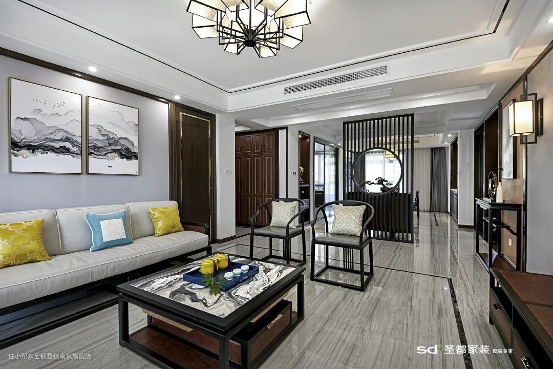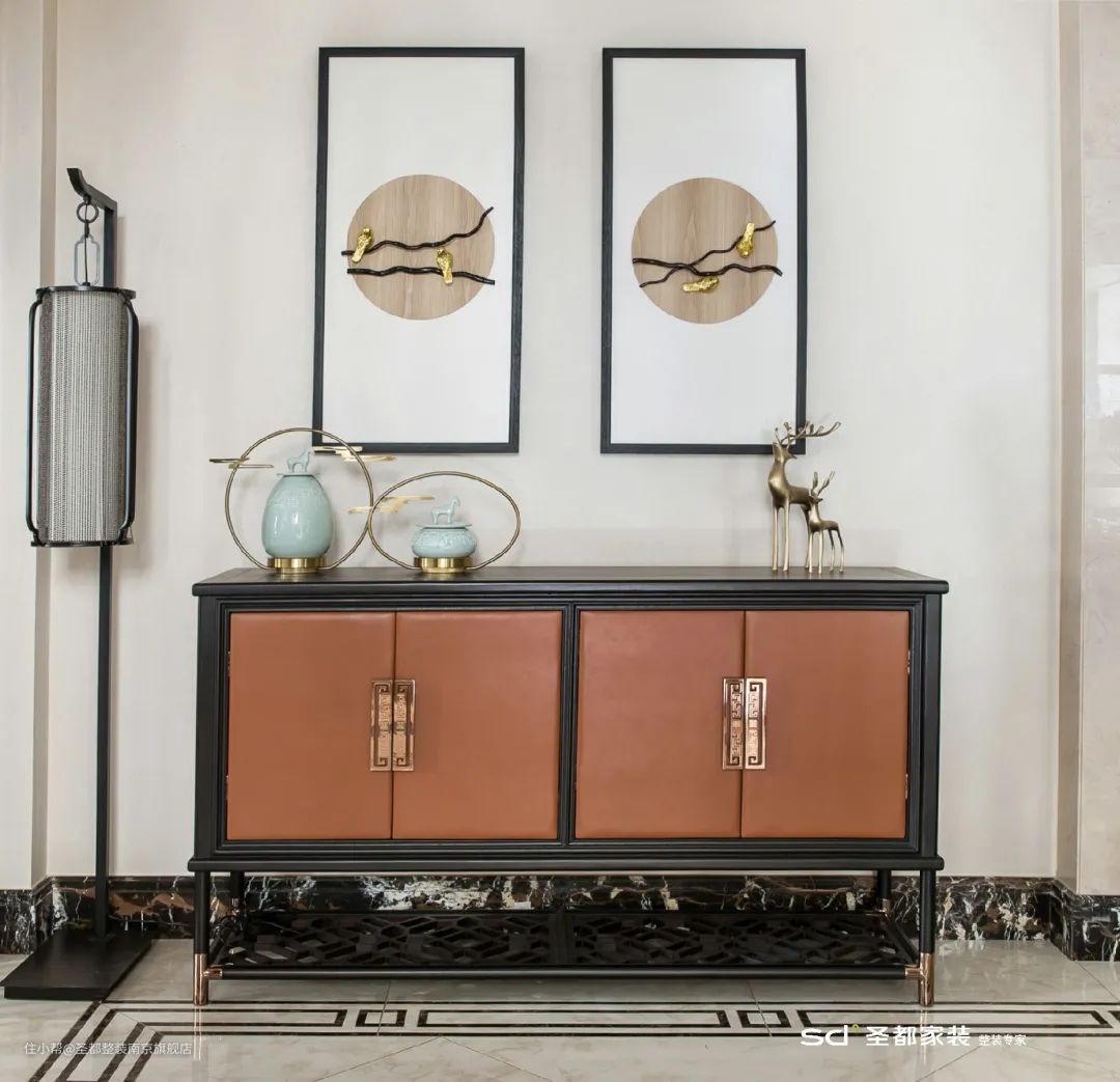 新中式的家居选材以自然质朴的木质为主,并融入大理石、皮质、金属等现代材质,让新中式焕发出时尚低奢的都市风采。