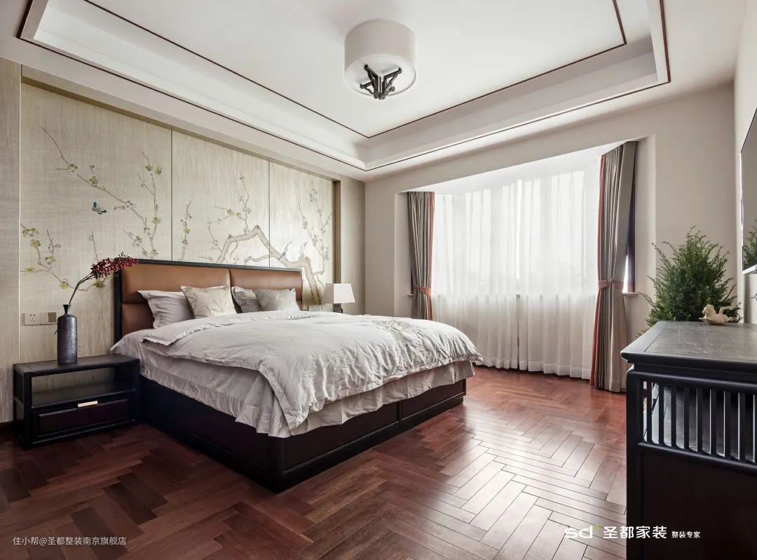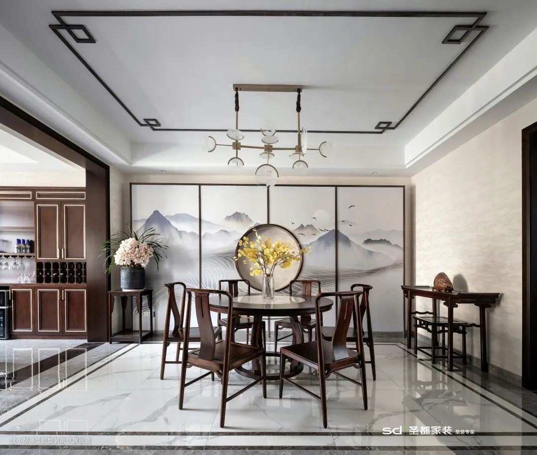 新中式没有浓墨重彩,力求素雅简约,呈现出典雅大方的空间状态,体现出主人恬淡含蓄的品性。