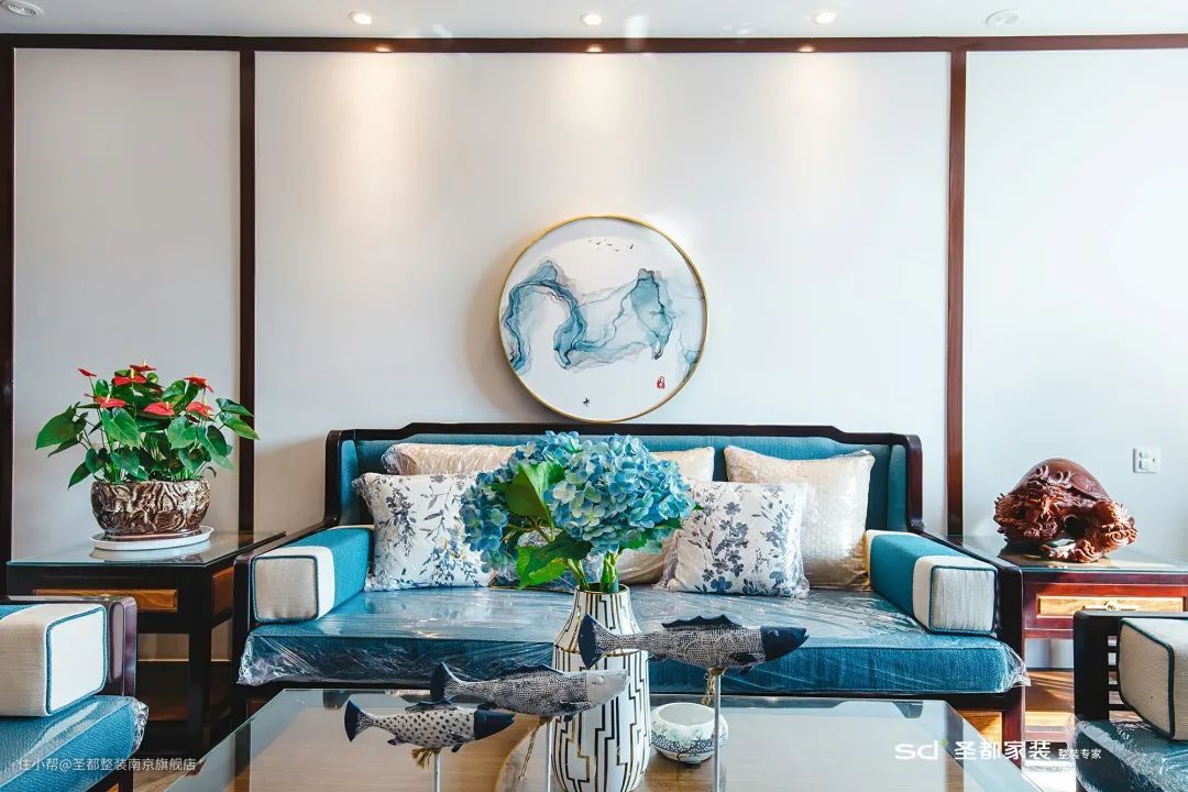圆弧挂画的蓝调搭配同色系软装,调和了古典实木的深沉气息,显得生动而灵气。