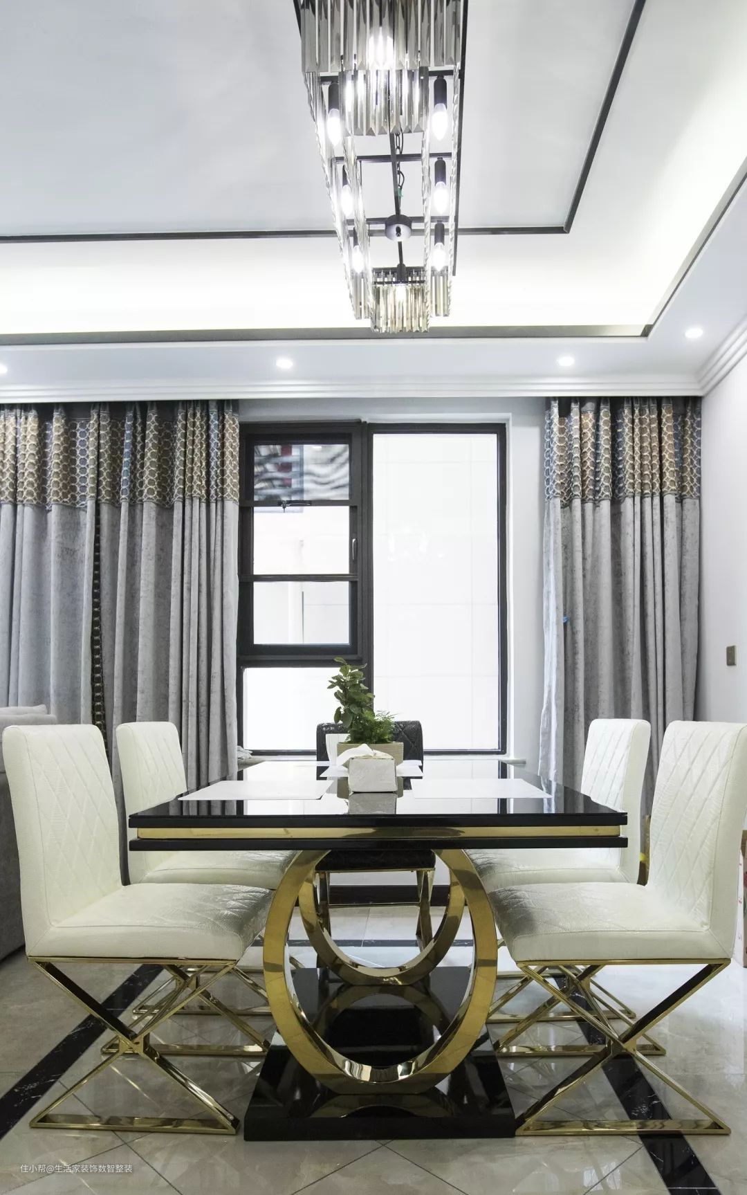 因为横厅的设计,我们首先看到的会是餐厅。水晶灯、金属线条,这些都是后现代风格的代表元素。