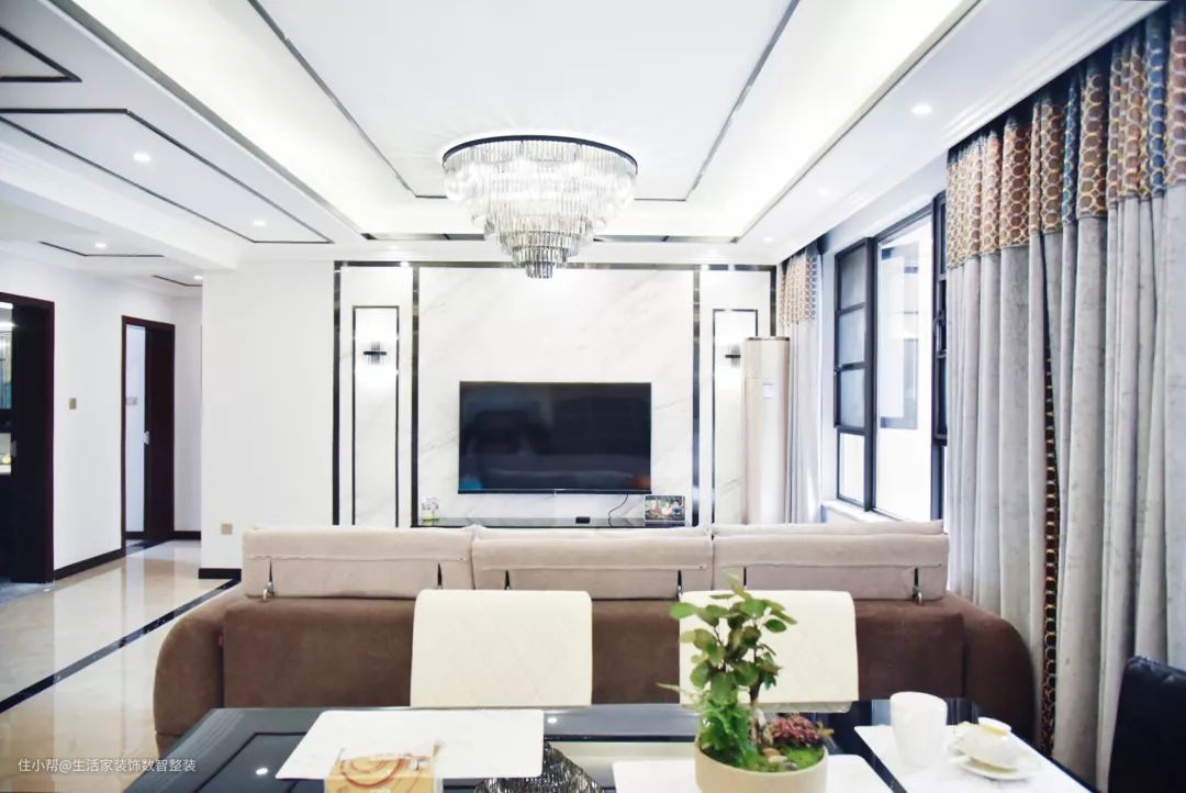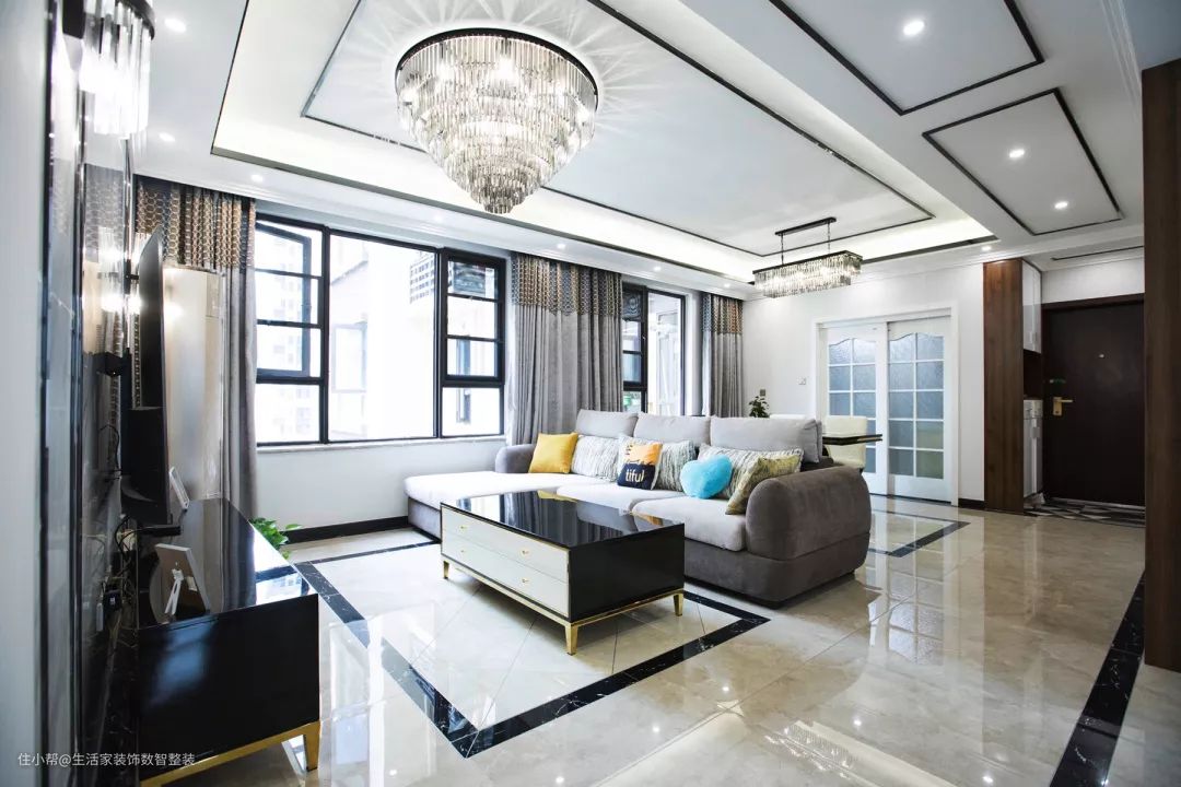 吊顶的框线与客厅地面的框线相互呼应,丰富了层次,释放了空间感。巨大的圆形水晶主灯释放着如麦芒一般的光线,衬托着整个天花板,大气奢华。