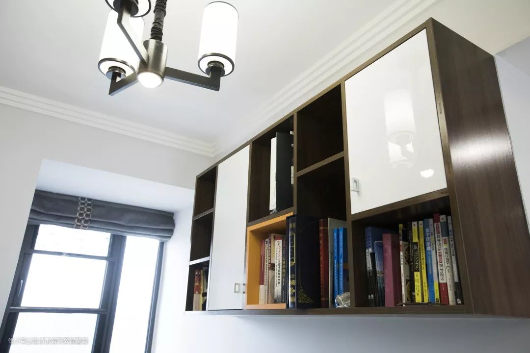 靠内的一侧为业主的工作区,上方的壁柜用于书籍的收纳,满足了日常的阅读需求。