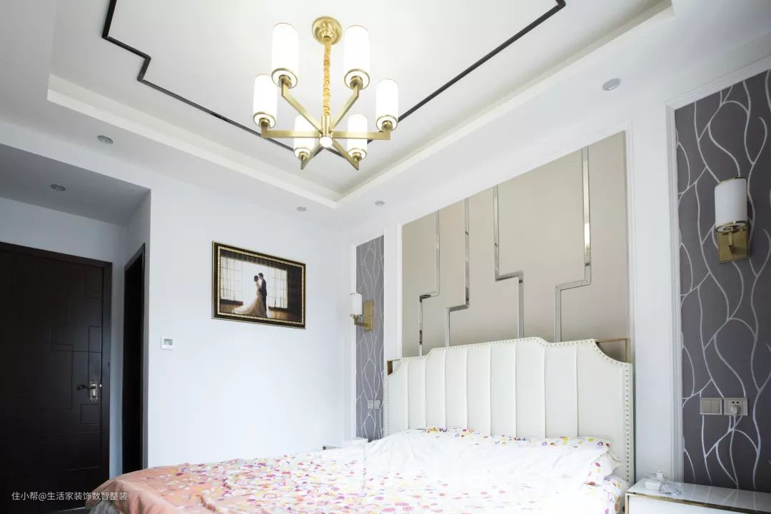 卧室搭配呼应了客厅区域,延续了后现代风的亮点,大量的金属线条让视觉得到了延展,拉伸了空间,床头软包的设计中和了金属带来的冰冷,使空间更加温馨。