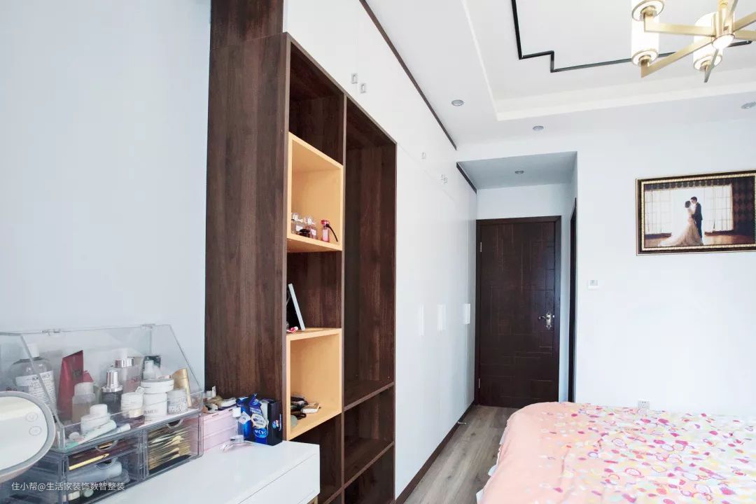 为了不影响业主的居住体验,设计师将入户右侧的墙体向内推移,形成一个凹槽,并将一块巨大的通天柜嵌入,解决了主卧的收纳问题。
