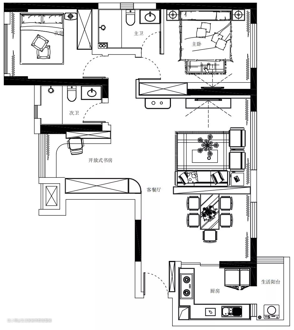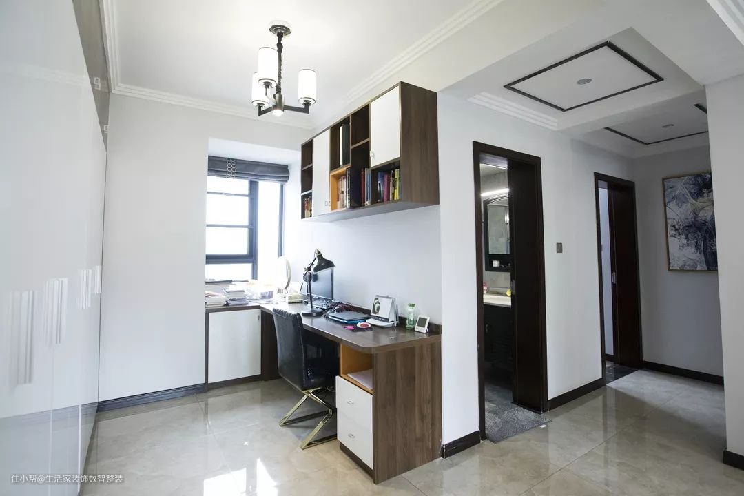 原户型图本是三室,为了满足业主要求,设计师将靠近第三室的L型墙体移除,与客厅连通,设计成了开放式书房,并在书房靠墙处设置了通天柜便于收纳。