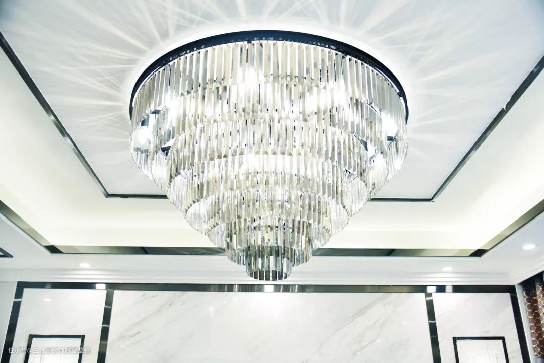 吊顶的金属线条拉伸了整体空间,带有灰度的水晶灯在色调上与吊顶保持了一致,形成了一个整体。