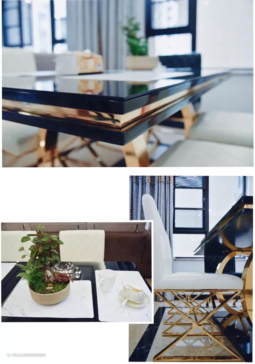 餐椅和餐桌都采用了大量的金属结构,在风格上形成统一,金属线条的交错也让整体显得高端优雅。