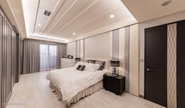 结合裱布板与贝壳被缀饰的床头主墙,藉由一整个墙面的线条布局,放大空间感。