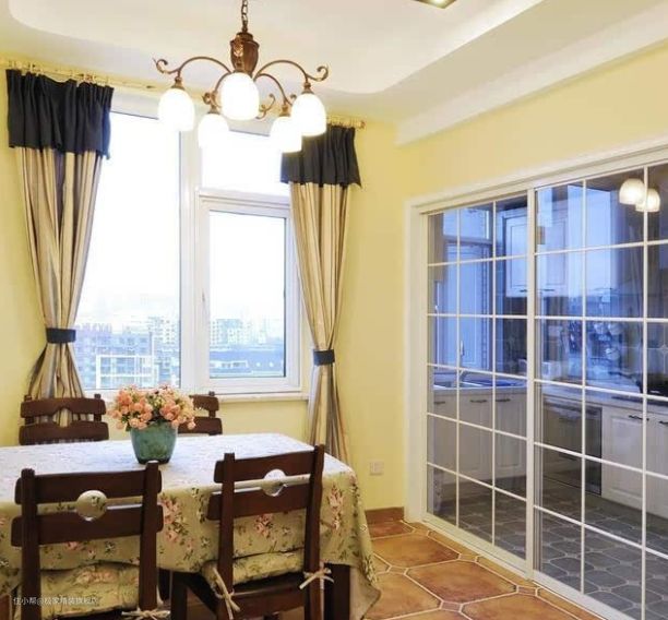 餐厅的布置其实颇有田园风的感觉:实木的餐桌椅,碎花的餐桌布,灰蓝色的百叶木门和窗台的薰衣草,这是多少文艺青年喜爱的田园风格呐。餐厅旁边的就是厨房,考虑到做饭的油烟大,没做开放式的,因此设计了推拉的玻璃门代替。