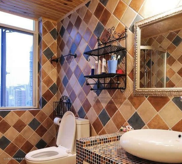 卫生间的装饰延续了地中海风格的俏皮,墙面以彩砖混拼而成,趣味十足。洗手台用马赛克瓷砖砌成,与彩砖的墙面相互搭配,竟然有种十分契合的感觉。