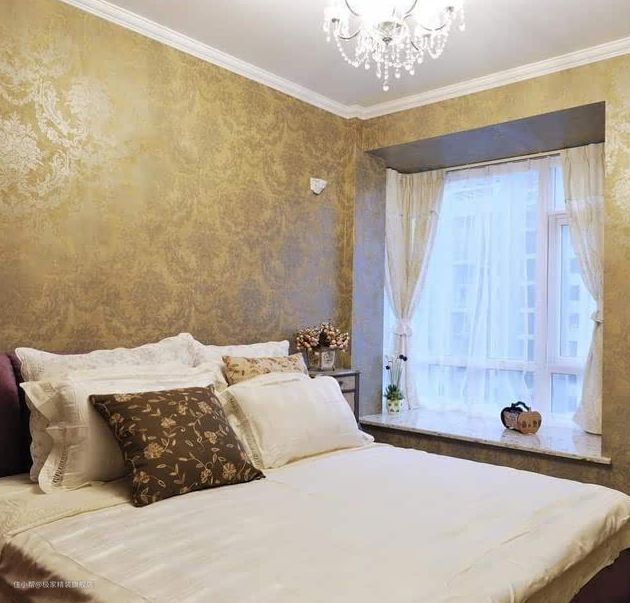 主卧以沉稳大方为主,所以色调上颜色要深些。暗金色墙纸惊艳奢华,深色地板沉稳大气,水晶吊灯闪亮晶莹,将居室空间打造出唯美浪漫。