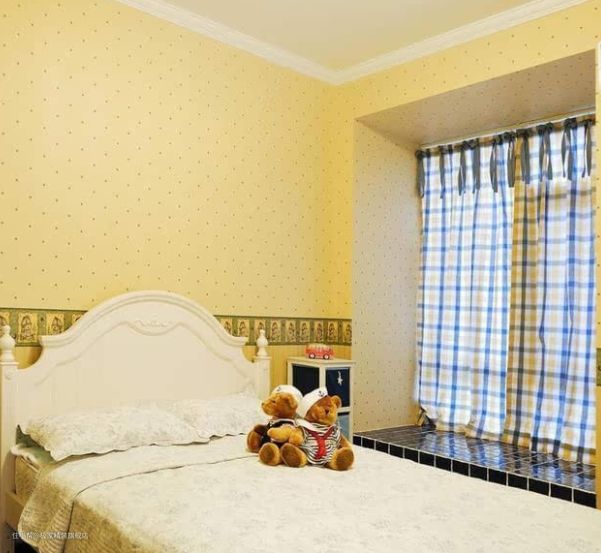 过道的另一边是女儿的房间,现做的一米五的榻榻米,再配上个格子窗帘,整个卧室是美式乡村的格调。女儿性格比较活泼,所以色调设计偏向轻快些,贴的都是黄色为主的壁纸。