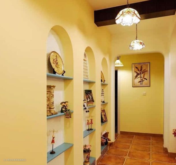 走廊里也是明黄色的墙面和复古的地板,搭配浅蓝色的置物架,别有一番地中海式风情。收纳是家居中一个重要的问题,设计师在墙面上做了许多内置的置物架,摆放上一些好看的饰品,不失为一道靓丽的风景。