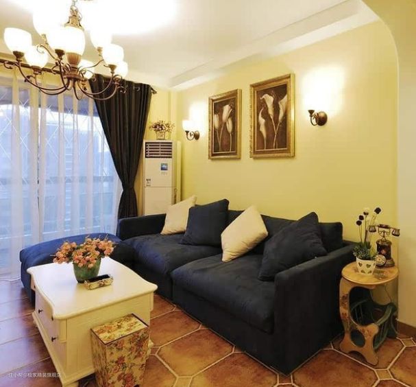 房间的墙壁刷成了淡淡的柠檬黄色,给人的感觉十分温馨。马赛克砌筑的地台华丽时尚,弱化了仿古地砖的单一感。电视背景墙的设计十分简单,与客厅、走廊的顶棚造型遥相呼应。藏蓝色美式布艺沙发是主人的大爱,沉静安静,又不乏洁净长久。以百合花为背景画的沙发背景墙,寓意家庭和和美美。
