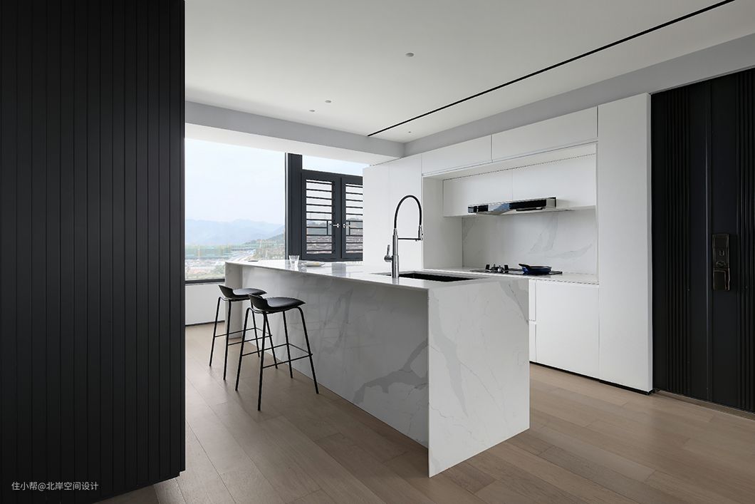 厨房运用了大笔的白色渲染,玻璃窗不仅增加了空间的通透感,同时将窗外的绿色美景印入其中,虚实相生。
