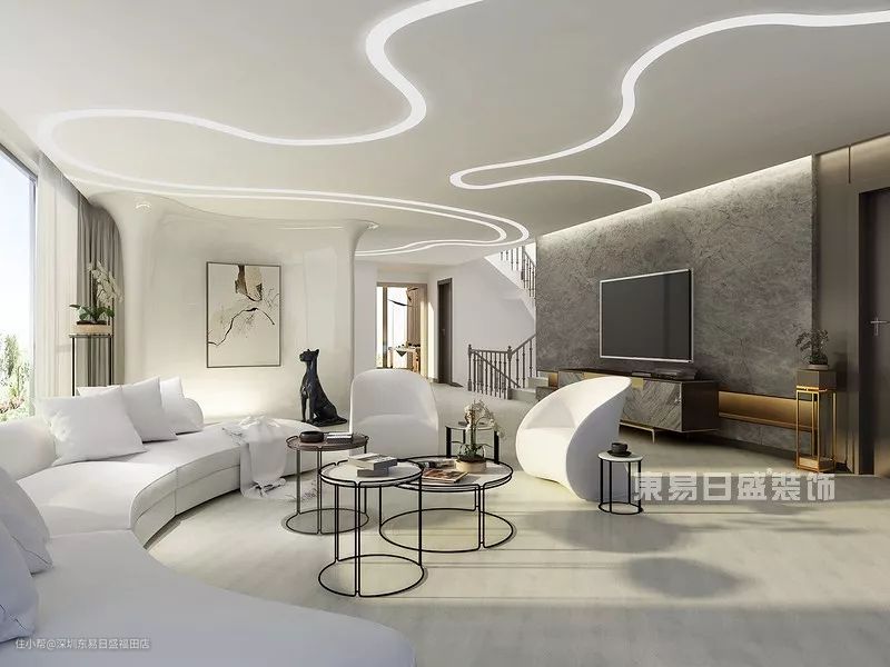 白色的沙发与整个纯白的空间呼应,行云流水的天花板线条像是飞机飞过云层留下的弧线。
