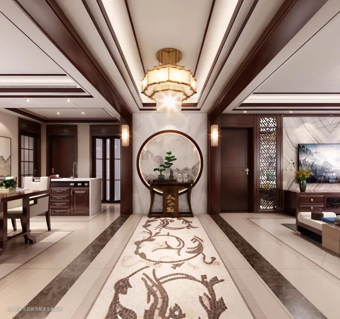 玄关一般会选择吊灯,在玄关吊顶设计要考虑到和地面搭配,对于两者之间位置、颜色上面要相互照应,进一步提升房子格调。