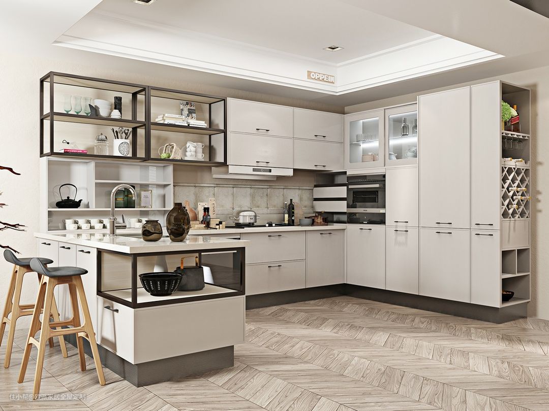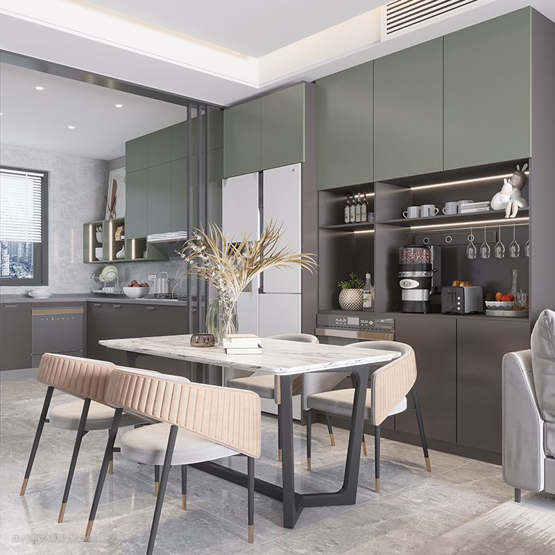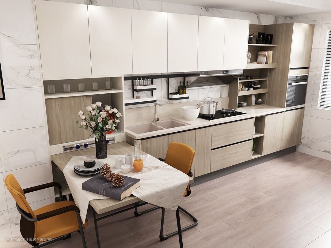 橱柜呈L字型、U字型,餐桌放在被橱柜包围的空间里,就像是橱柜与餐桌互相环抱着。这种设计的餐厨一体化程度高,和谐统一。