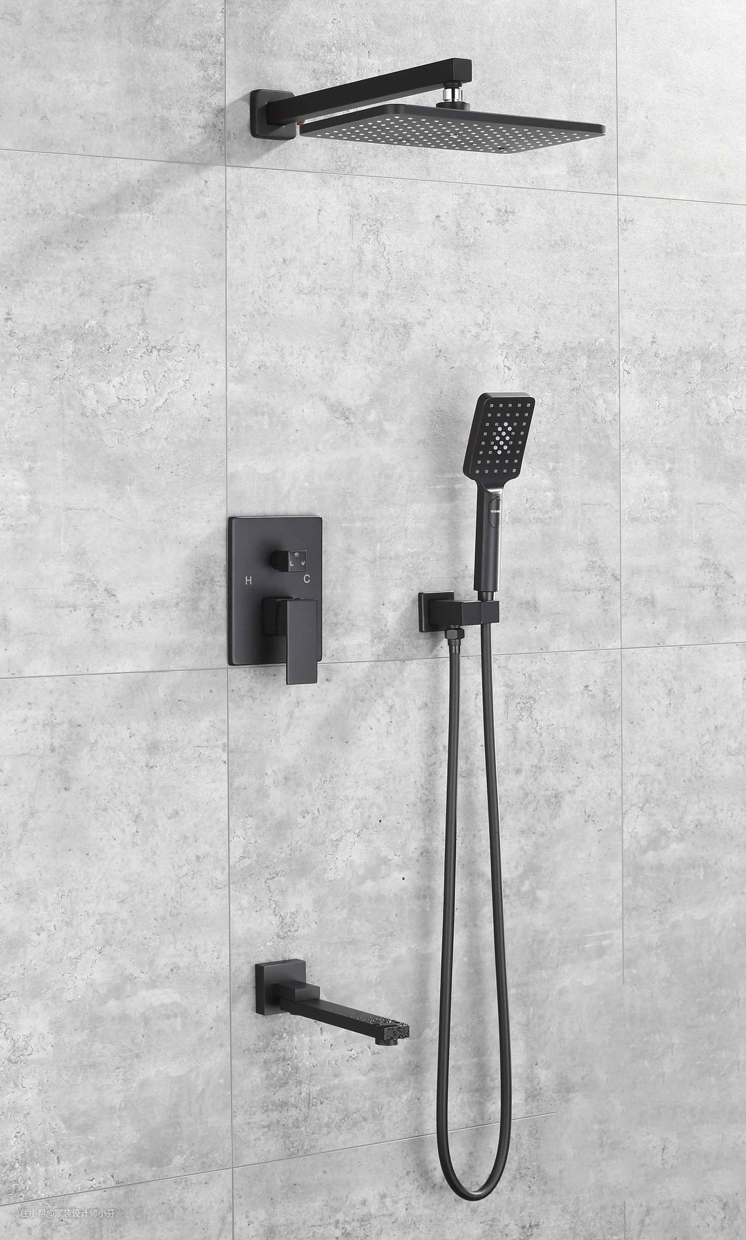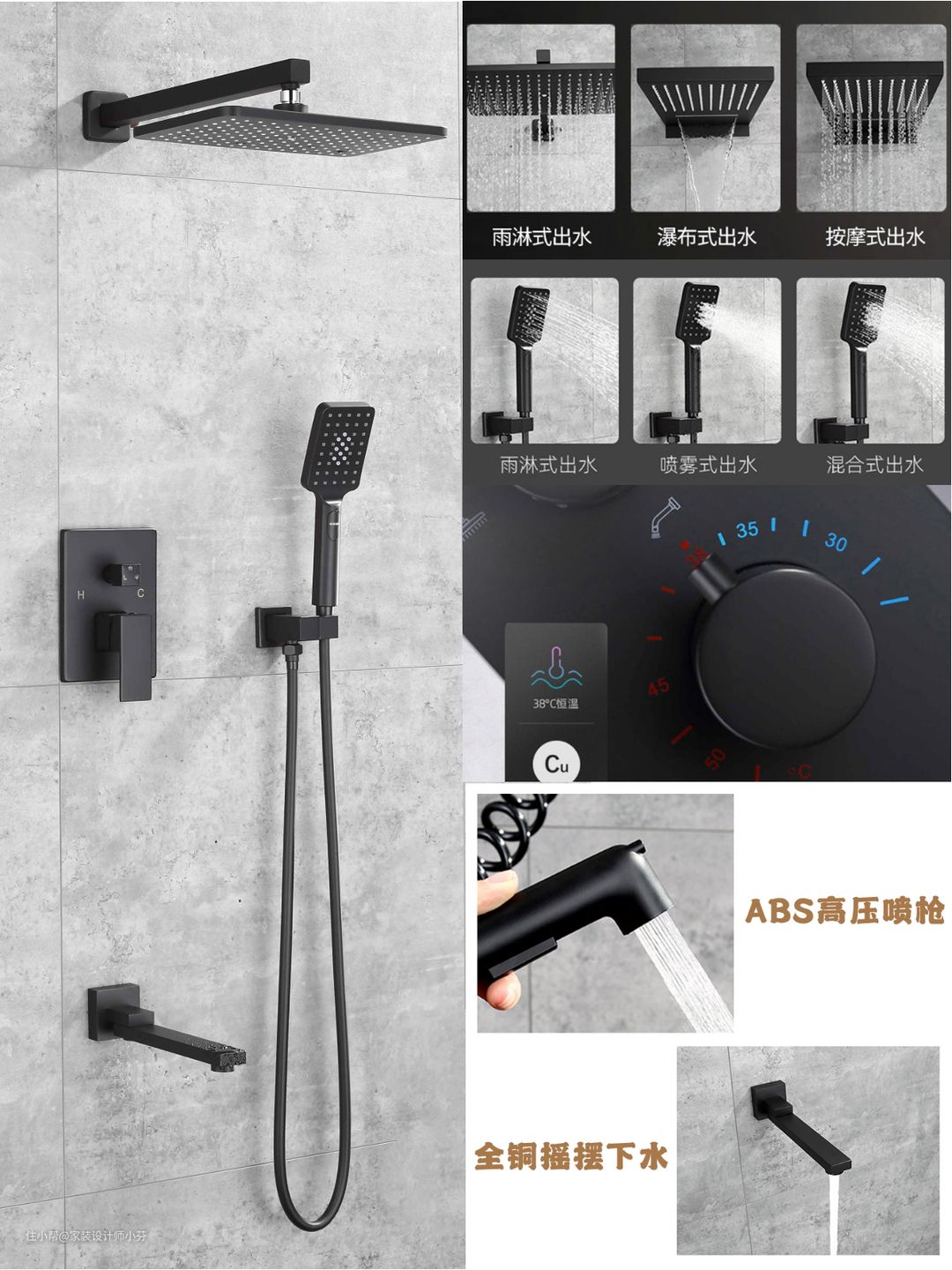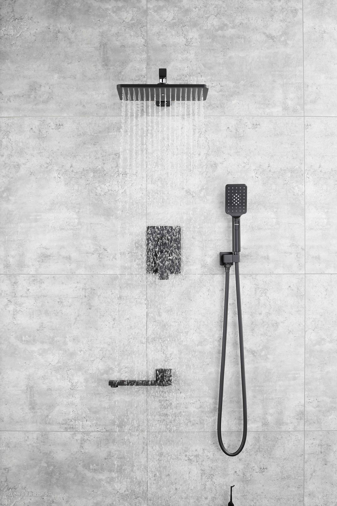 这款花洒属于入墙式花洒,顾名思义,就是暗装,直接把花洒的主体埋入到墙体内,肉眼只能看见露出的喷头、手持花洒和开关,整体黑色,简约大方,没有过多累赘的设计,不但节省空间,还给人一种与生俱来的高级感。