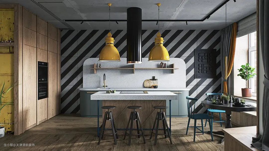 以岛台为中心,黄色吊灯搭配黑色排烟筒,黑灰色纹理相间的墙面背景墙;有工业风的质感,又感受不到冰冷,很有用餐氛围。