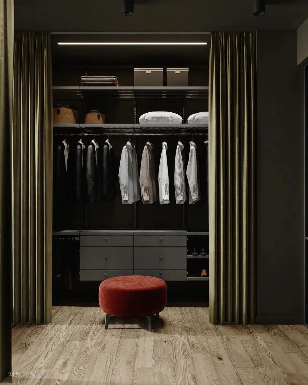 通往主卫的过道两边,分别是衣橱,布帘代替木门,简约不占空间、使用也还是蛮方便的。